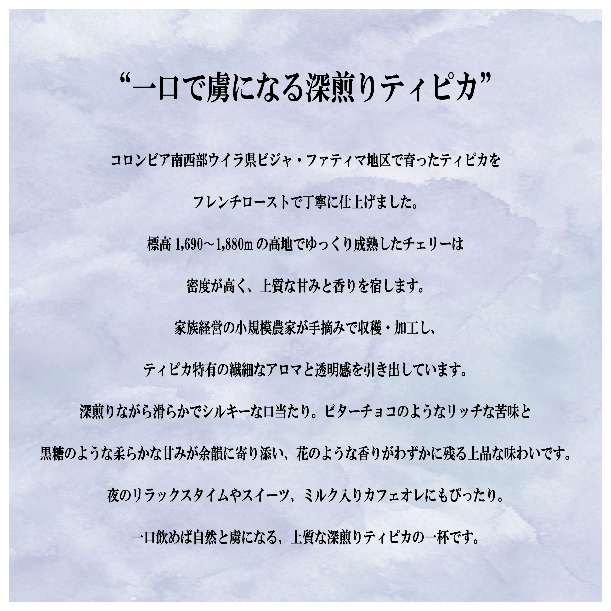 深煎りにすることでティピカの輪郭が引き締まり、ビターチョコレートを思わせるリッチなビター感が際立ちます。